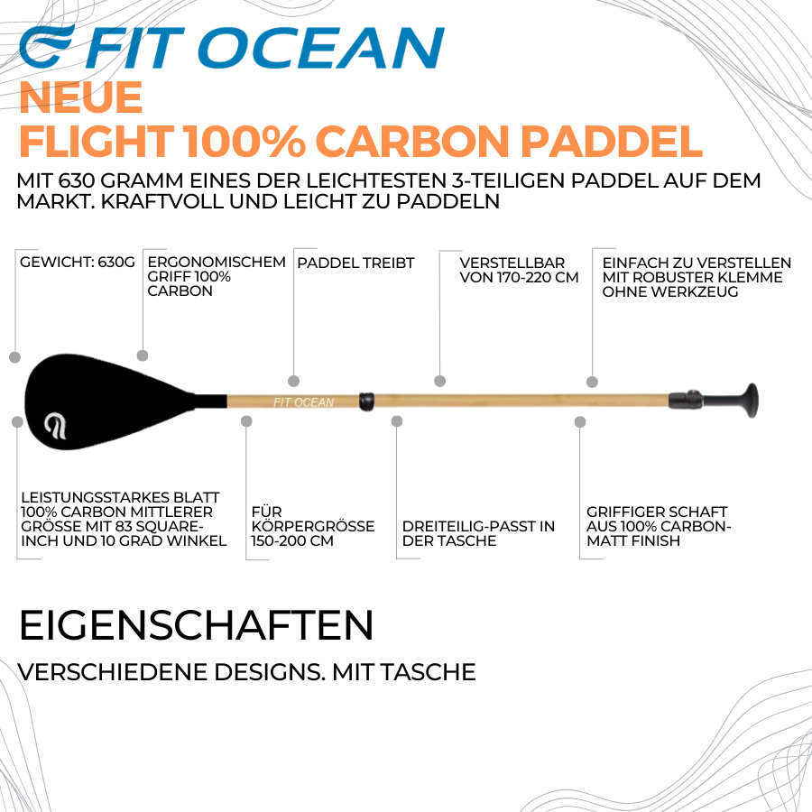 Wir wollen dasselbe wie Sie. Ein leichtes Paddel, mit einem mittelgroßen Blatt mit 10 Grad Biegung. Ein Paddel, das stabil und kontrolliert im Wasser liegt und das zu einem fairen Preis angeboten wird. Passende Länge der einzelnen Teile, damit die untere Hand nie auf dem Clip liegt. Um das Paddel perfekt zu machen, verwenden wir super starke Klemmen (diese verbinden die verschiedenen Paddelteile), damit es einfach halt! Unser Lieblings-Ergonomische Carbon-Griff. Das gesamte Carbon ist matt (und nicht glänzend), so dass es auch bei Nässe oder Schweiß super griffig bleibt.